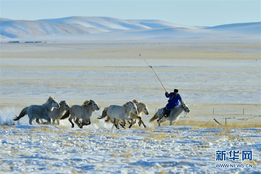 1月8日,牧民進(jìn)行套馬表演。 時(shí)下正值草原冬季旅游旺季,內(nèi)蒙古自治區(qū)西烏珠穆沁旗的牧民們?cè)谘┰弦徽股硎?,為游客展現(xiàn)獨(dú)特的民族風(fēng)情。 新華社記者 鄒予 攝