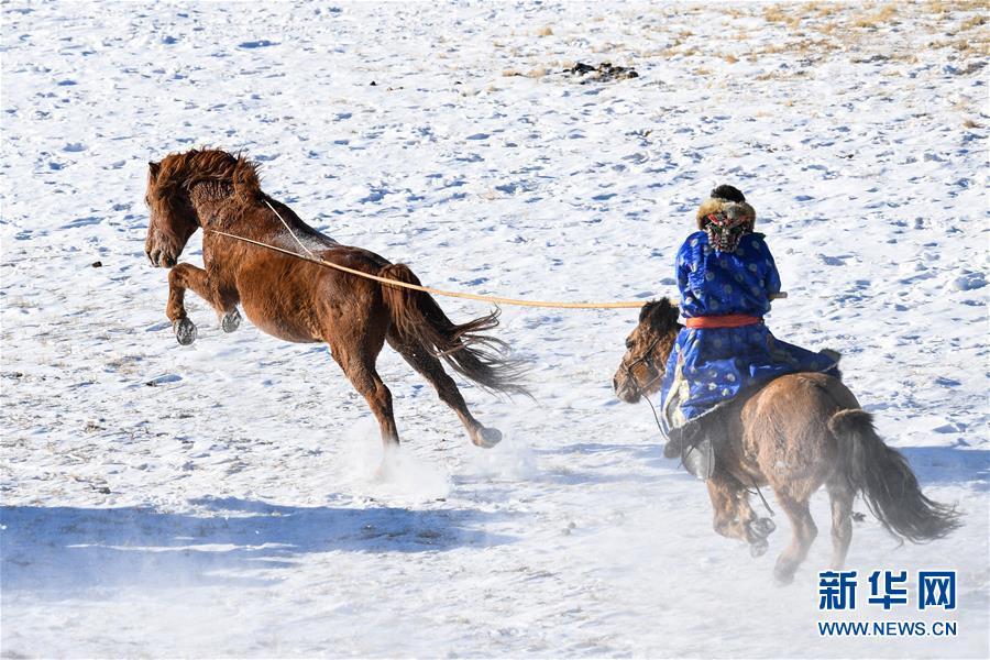 1月8日,牧民進行套馬表演。 時下正值草原冬季旅游旺季,內(nèi)蒙古自治區(qū)西烏珠穆沁旗的牧民們在雪原上一展身手,為游客展現(xiàn)獨特的民族風(fēng)情。 新華社記者 劉磊 攝