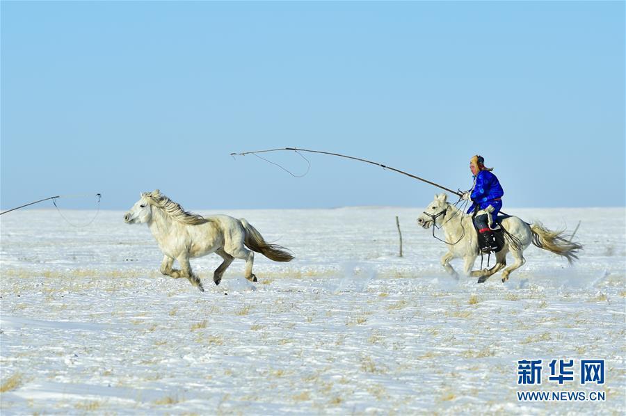 1月8日,牧民進行套馬表演。 時下正值草原冬季旅游旺季,內(nèi)蒙古自治區(qū)西烏珠穆沁旗的牧民們在雪原上一展身手,為游客展現(xiàn)獨特的民族風(fēng)情。 新華社記者 鄒予 攝