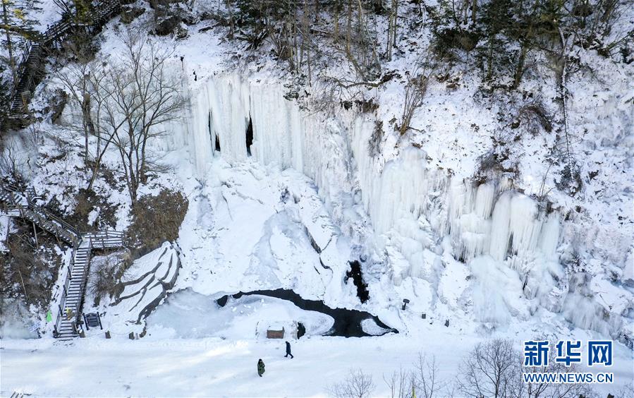 這是在吉林省長白縣十五道溝望天鵝景區(qū)拍攝的冰瀑景觀(1月3日無人機(jī)拍攝)。新華社記者許暢攝