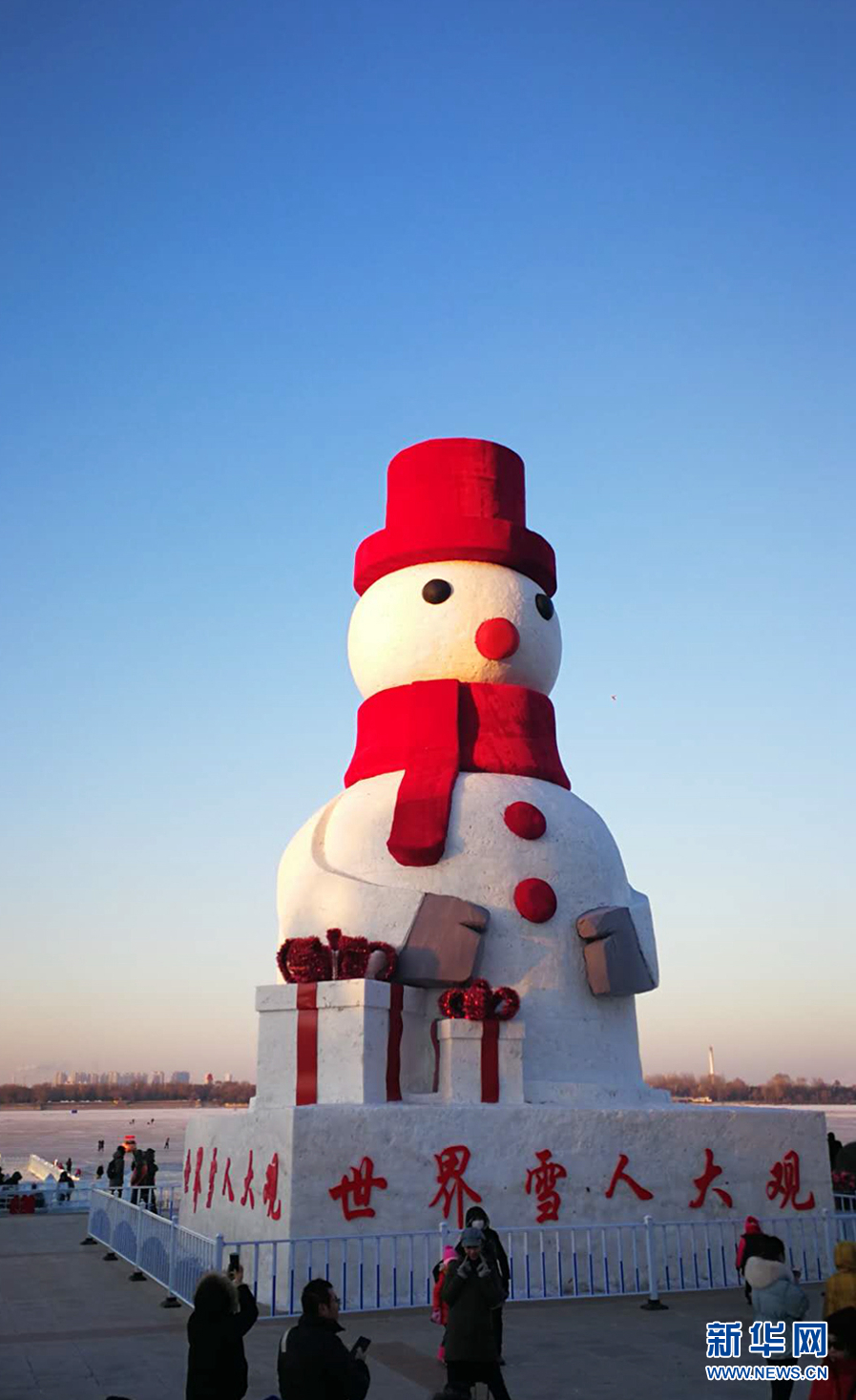 坐落在松花江畔的巨型雪人高20米,引眾人駐足拍照。 新華網(wǎng)記者 張明宇 攝