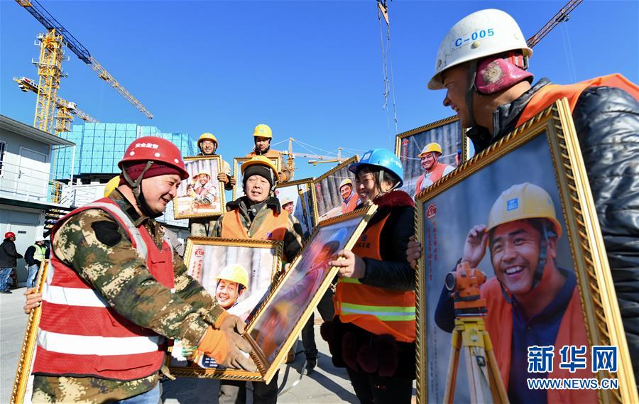 1月9日,中建一局北京城市副中心周轉(zhuǎn)房項目工地的工人在觀看自己的照片。 當(dāng)日,由北京市總工會主辦的工會“兩節(jié)”送溫暖活動之一的“把微笑帶回家,為最美勞動者點贊”大型公益活動,在中建一局北京城市副中心職工周轉(zhuǎn)房項目工地舉行。眾多勞動者獲贈“微笑”肖像照和保溫壺、毛巾等新春“大福包”。 新華社記者 李欣 攝