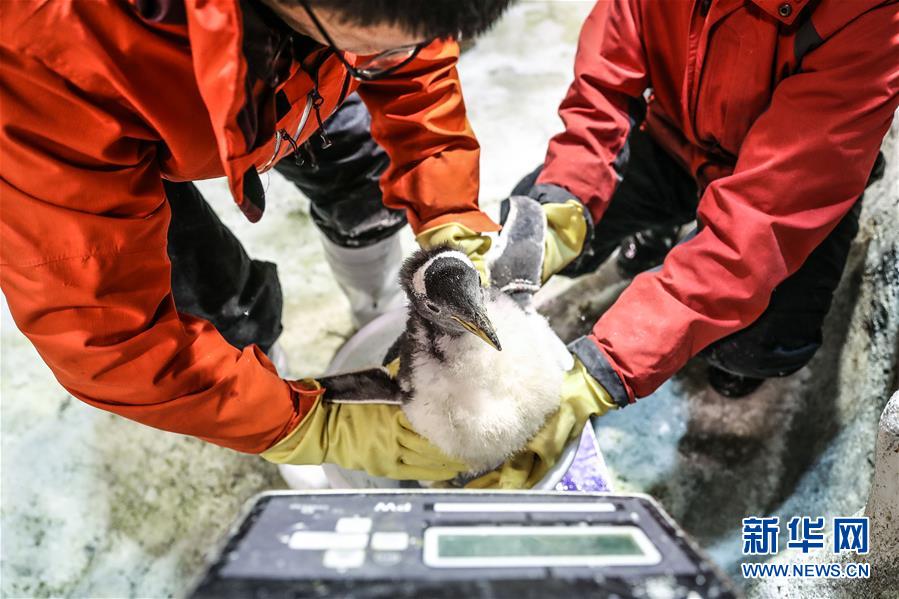 1月9日,馴養(yǎng)員給白眉企鵝寶寶稱重。