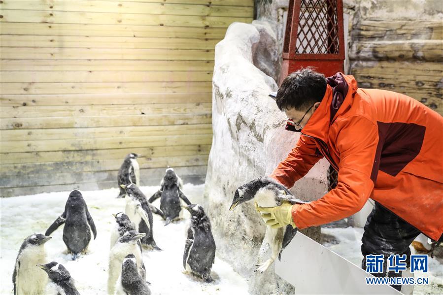 1月9日,馴養(yǎng)員準備給白眉企鵝寶寶喂食。 新華社記者 潘昱龍 攝