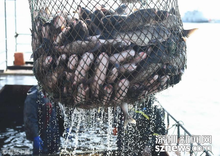 當(dāng)日,浙江省杭州市淳安縣千島湖中心湖區(qū)上演巨網(wǎng)捕魚,30余名捕撈隊(duì)員經(jīng)過(guò)半個(gè)多小時(shí)拉網(wǎng),獲得大豐收。