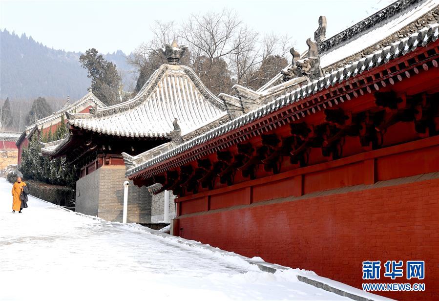 1月10日,少林寺一名僧人在雪中行走。當日,雪后初霽,河南登封少林寺分外秀美。 新華社記者 朱祥 攝