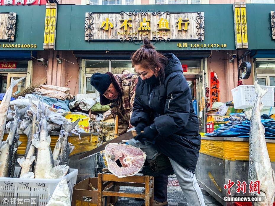寒冬臘月是黑龍江撫遠(yuǎn)的凍魚銷售旺季。讓人大開眼界的是,一二百斤大魚得鋸開了賣;最讓魚販子開心的是,最多一天進(jìn)賬5萬元。魚販子半開玩笑地說:不是說數(shù)錢數(shù)到手抽筋嗎?進(jìn)錢最多的一天,還真差不多。圖為1月12日,黑龍江省佳木斯市撫遠(yuǎn)東極魚市,商戶在用鋸截斷凍魚。棋簿紫 攝 圖片來源:視覺中國