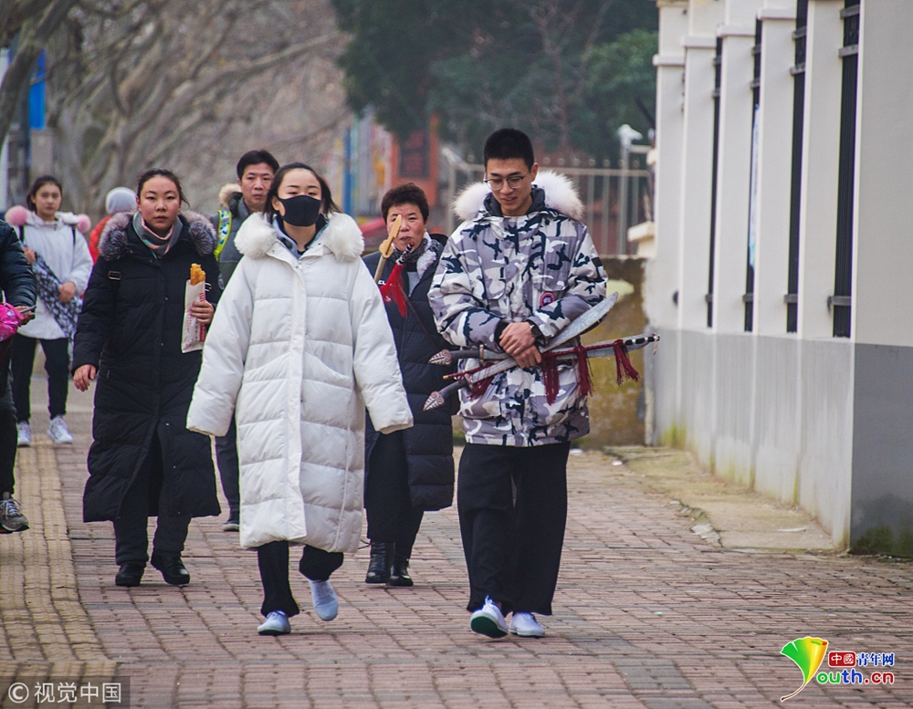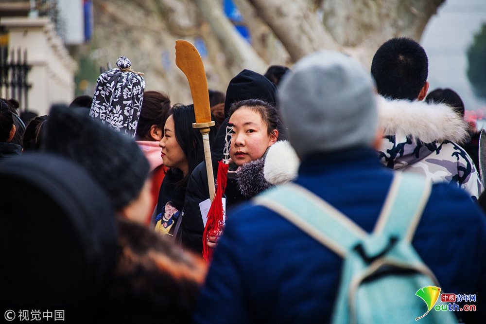 2019年1月14日,上海,上戲“藝考”第一階段第一天,不少考生從全國(guó)各地趕來,有的帶著樂器,有的帶著“刀槍”,在考點(diǎn)門口候考時(shí),還不時(shí)地練習(xí)下。