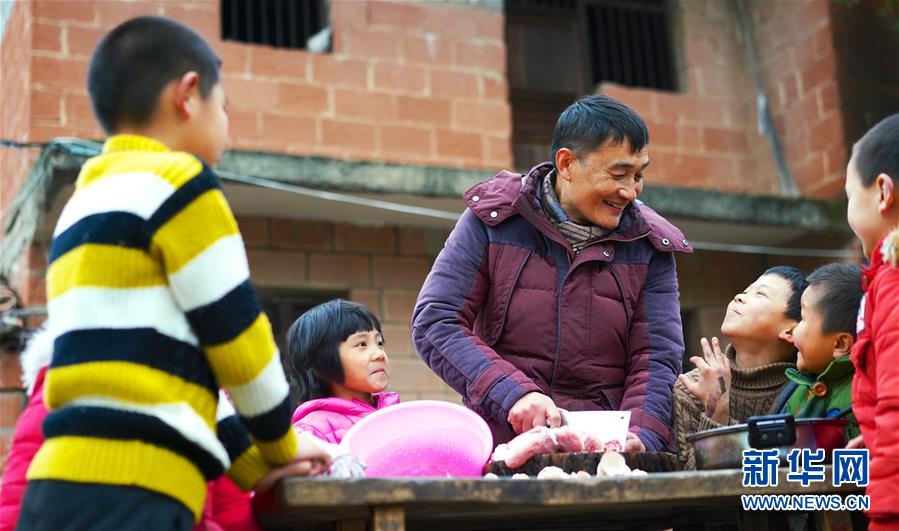 1月3日,章站亮(左三)在學校的操場上切肉。由于學校沒有室內(nèi)的廚房和食堂,章站亮只能在露天的環(huán)境下為學生們準備餐點。 新華社記者 胡晨歡 攝