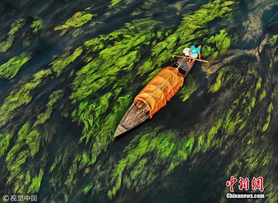 孟加拉國(guó)河流清澈見底 漁船暢行水藻間構(gòu)成美麗圖畫