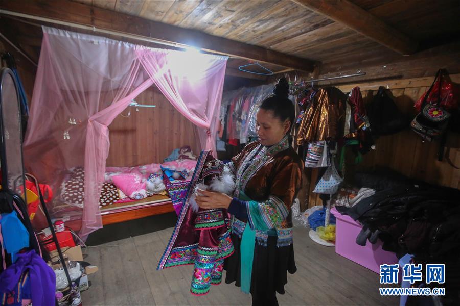 1月15日,在廣西融水苗族自治縣融水鎮(zhèn)夢嗚苗寨一處吊腳樓內(nèi),居民在房間整理衣服。新華社記者 陳君清 攝