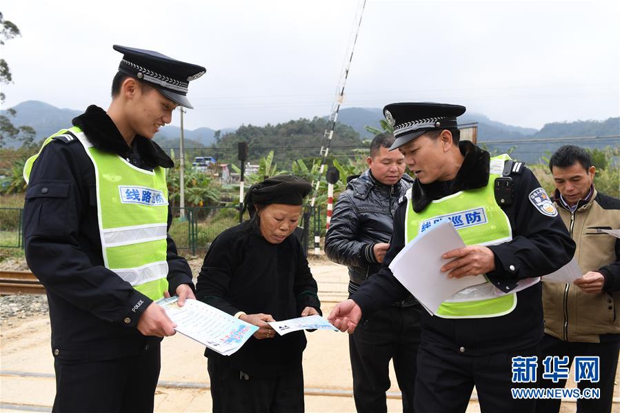 鐵路公安民警陸日峰(前排右一)和同事在中越邊境巡線時給鐵路沿線的群眾發(fā)放安全宣傳單(2018年12月31日攝)。 新華社記者陸波岸攝