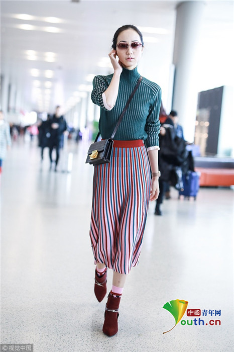 2019年1月17日,上海,韓雪現(xiàn)身機(jī)場(chǎng),穿著條紋紗裙露出小腿,十分抗凍,她搭配經(jīng)典的駝色大衣,氣質(zhì)出眾在機(jī)場(chǎng)人群中相當(dāng)搶鏡。