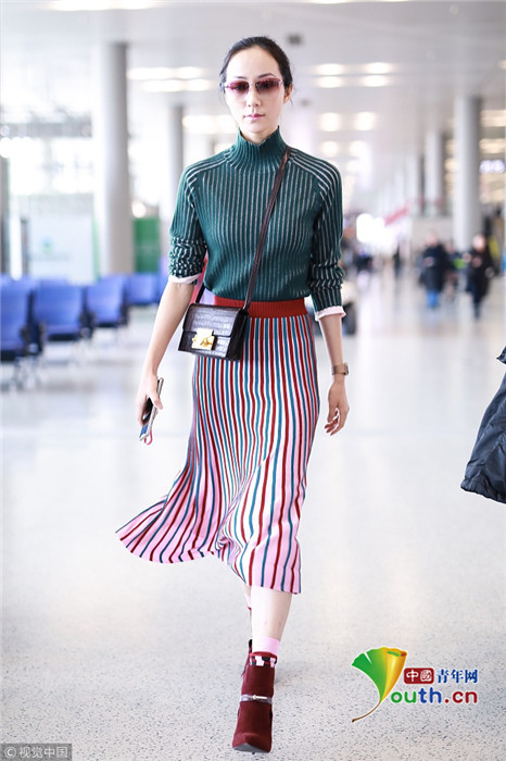 2019年1月17日,上海,韓雪現(xiàn)身機(jī)場,穿著條紋紗裙露出小腿,十分抗凍,她搭配經(jīng)典的駝色大衣,氣質(zhì)出眾在機(jī)場人群中相當(dāng)搶鏡。