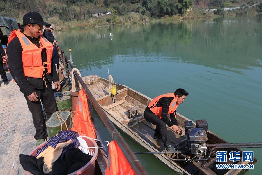 1月22日,賴福昌(右)在發(fā)動小船上的發(fā)動機(jī),小船是大船的動力來源。 新華社記者 歐東衢 攝