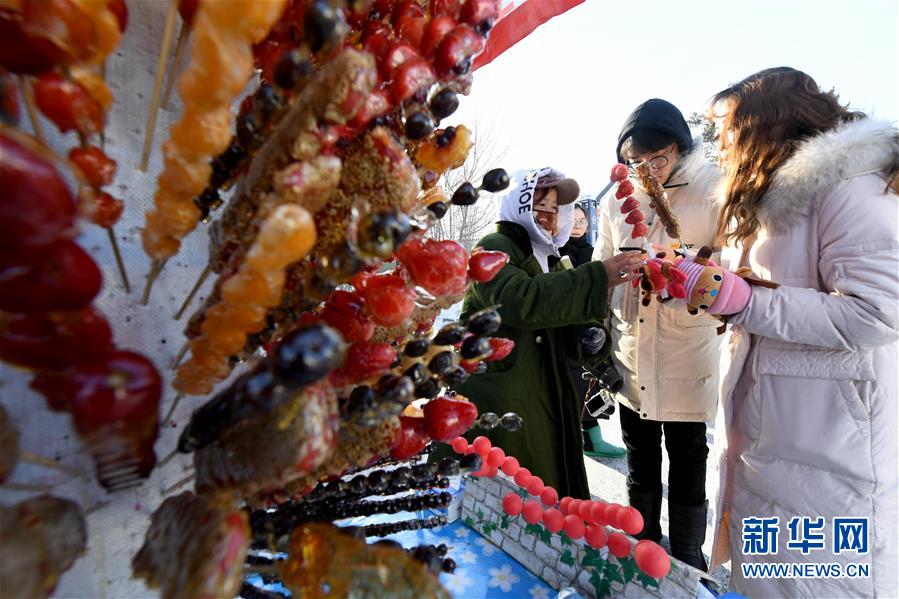 1月24日,在黑龍江省漠河市北極村,顧客在“最北糖葫蘆”攤買糖葫蘆。新華社記者王毓國攝