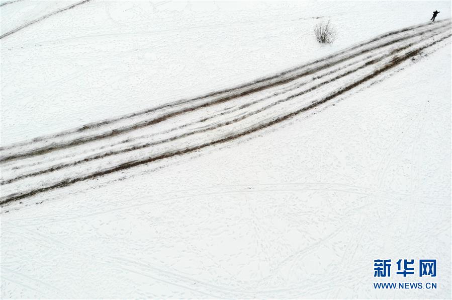 1月24日,在黑龍江省漠河市北極村,馬爬犁在雪地上留下一道道痕跡(無人機拍攝)。新華社記者 才揚 攝