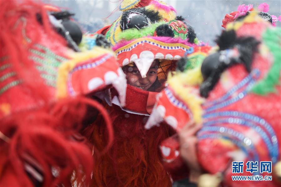 2月16日,群眾在青海省大通回族土族自治縣文化廣場(chǎng)冒雪觀看社火表演。新華社記者吳剛攝