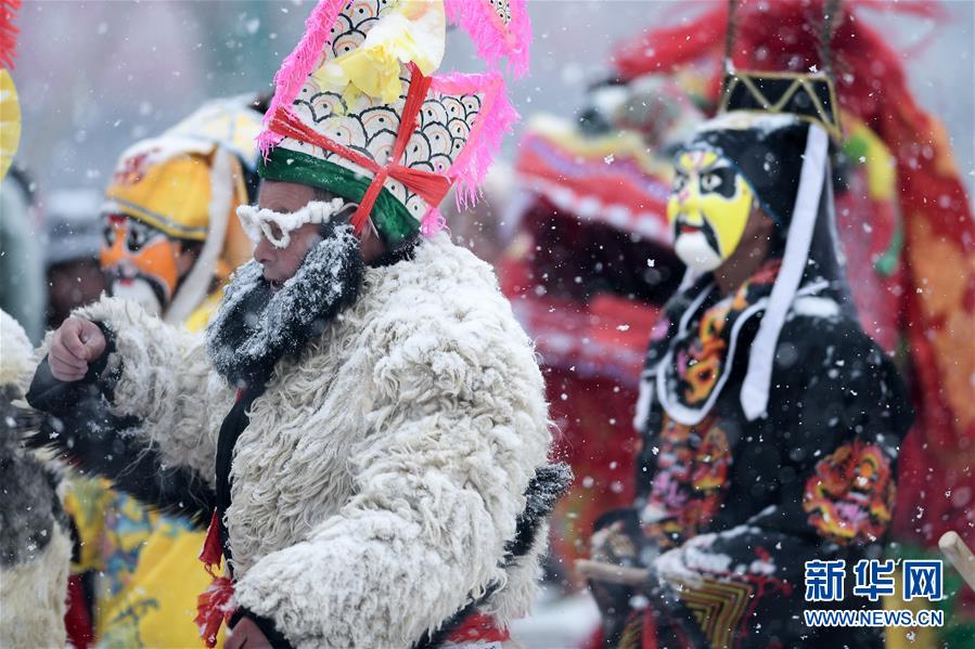 2月16日,社火隊(duì)演員在青海省大通回族土族自治縣文化廣場表演。新華社記者吳剛攝