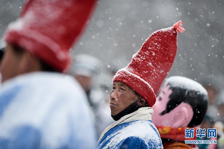 2月16日,社火隊(duì)演員在青海省大通回族土族自治縣文化廣場表演。新華社記者吳剛攝