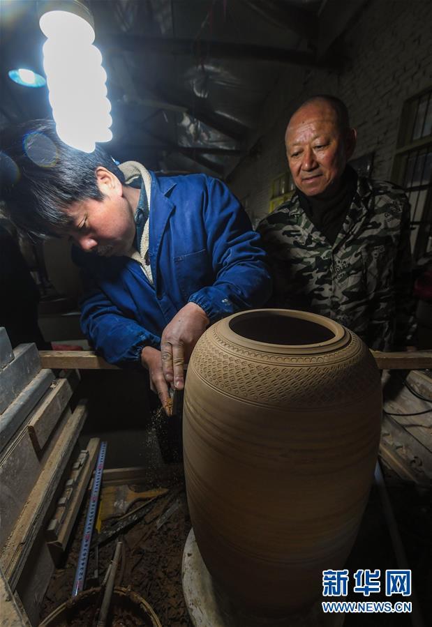 2月16日,陳新華(右)在指導徒弟修坯。新華社記者 徐昱 攝