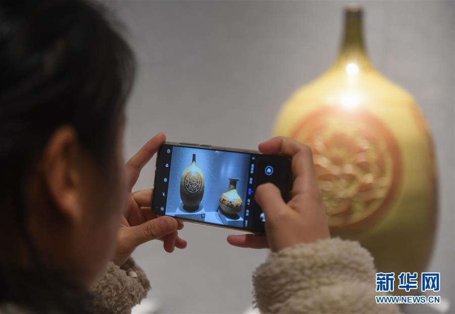2月16日,一名游客在婺窯小鎮(zhèn)陳新華的工作室內(nèi)觀看婺州窯作品。新華社記者 徐昱 攝
