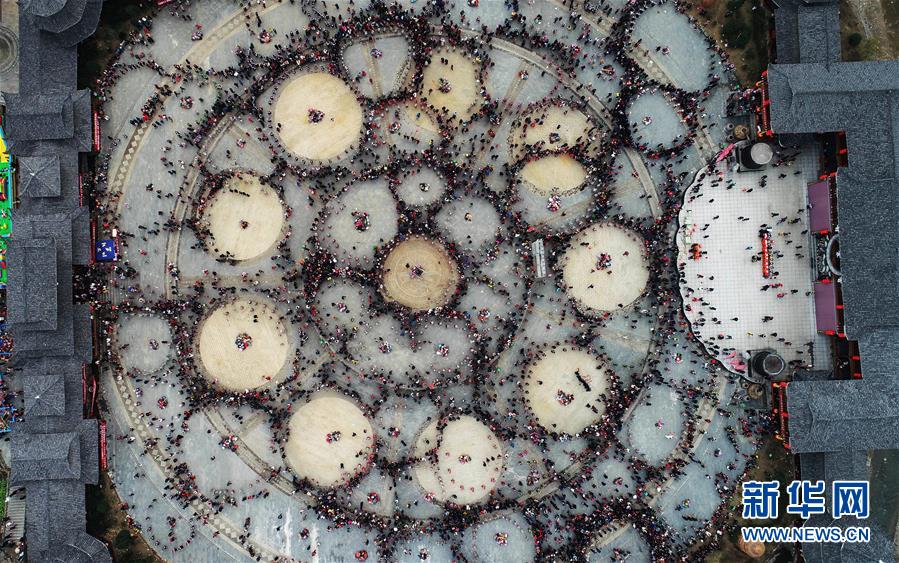 2月24日,在貴州省凱里市舟溪鎮(zhèn),苗族群眾在跳蘆笙舞(無人機(jī)拍攝)。 當(dāng)日,在貴州省黔東南苗族侗族自治州凱里市舟溪鎮(zhèn),來自各地的苗族群眾身著節(jié)日盛裝,歡聚在古老的“甘囊香”蘆笙堂,男子吹奏起蘆笙,姑娘和孩子們跳起蘆笙舞,歡度新春,祈求風(fēng)調(diào)雨順、五谷豐登,青年男女也借此良日尋覓意中人。  “甘囊香”是苗語音譯,意思為“河流的下游,神仙匯聚的地方”?!案誓蚁恪碧J笙會是貴州規(guī)模最大、最古樸的苗族蘆笙會之一。  新華社記者楊文斌攝