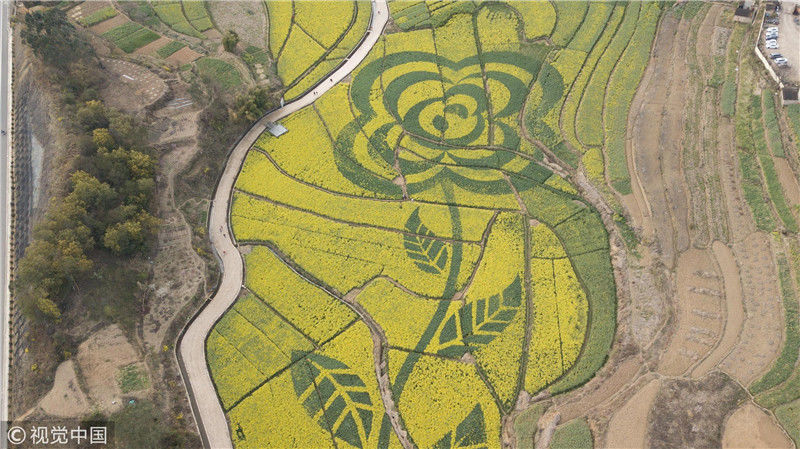 2019年近日,在云南省安寧市山口村,油菜花田里“長出”一朵巨大的“山茶花”,吸引游客到此觀賞拍照。圖為3月1日,航拍油菜花田中的山茶花圖案。劉冉陽(云南分社)/中新社/視覺中國