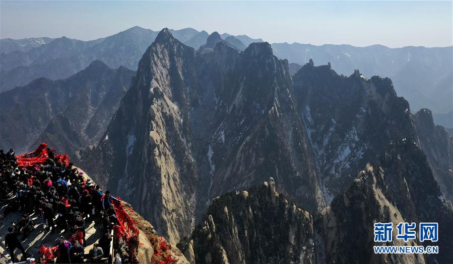 3月9日,游人在華山南峰游覽(無人機(jī)拍攝)。 隨著氣溫回升,陜西著名風(fēng)景區(qū)華山進(jìn)入旅游旺季。 新華社記者 陶明 攝