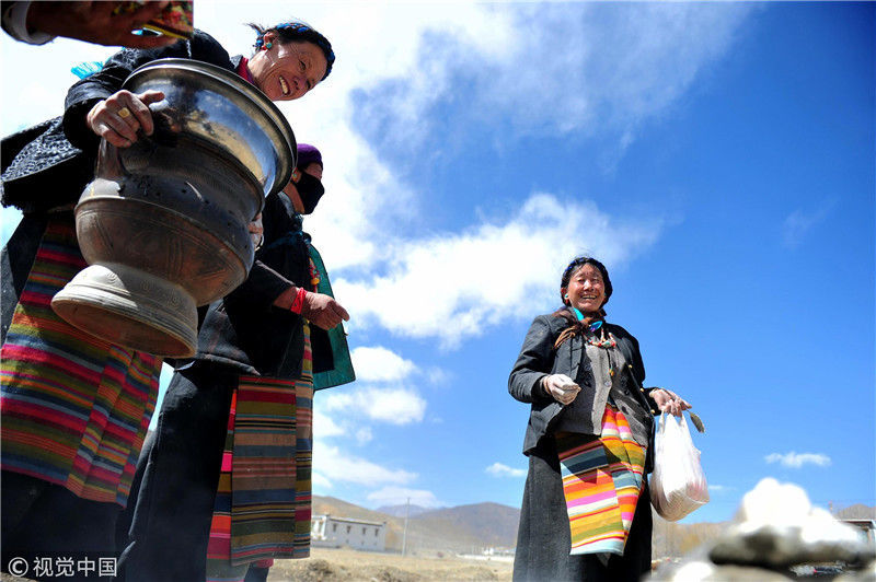 2019年3月16日,西藏各地迎來開耕節(jié)。位于年楚河畔的日喀則白朗縣被譽為“后藏糧倉”,當日,當?shù)夭刈遛r(nóng)牧民將家里的耕牛裝扮一新,對農(nóng)田進行開耕,大家齊聚青稞地,慶祝春播開始。圖為白朗縣洛江鎮(zhèn)民眾在青稞地里煨桑煙(一種祈福方式)、敬獻青稞酒,祈福新的一年風調(diào)雨順、五谷豐登。 江飛波(西藏分社)/中新社/視覺中國 編輯/陳進