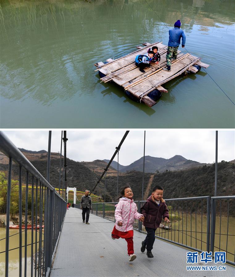 這是一張拼版照片:上圖為略陽縣徐家坪鎮(zhèn)藥木院村江口壩組的余皓軒(左)、劉紫涵(中),由余皓軒的外公劉德安撐上簡易木筏,去對岸的幼兒園上學(2018年11月22日無人機拍攝);下圖為余皓軒(前右)、劉紫涵(前左)放學歸來,手拉手走在新修的鋼結(jié)構(gòu)吊橋上(2019年3月25日攝)。