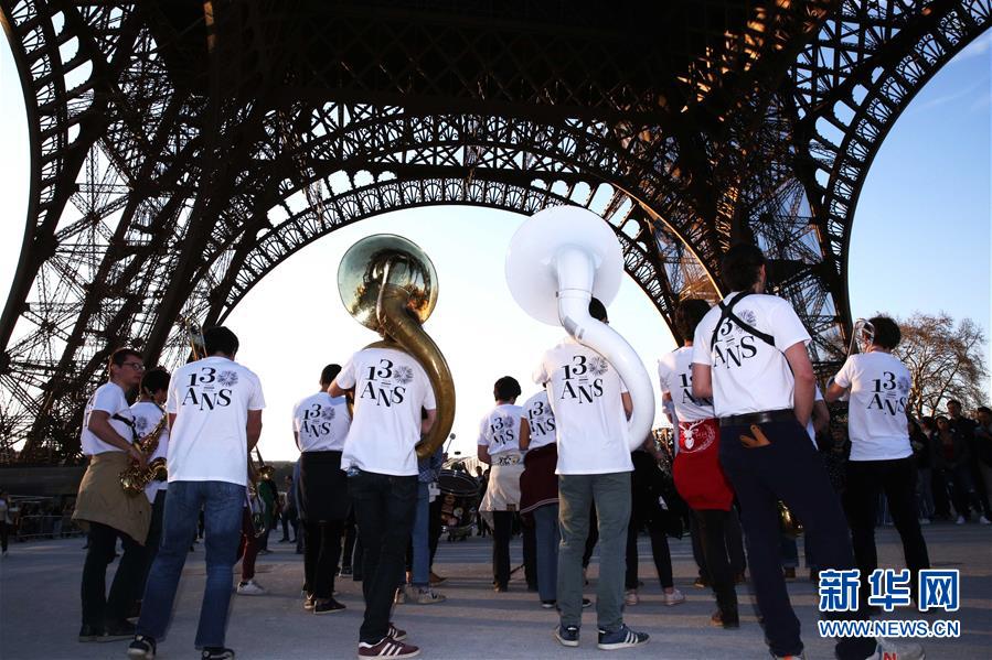 3月30日,在法國巴黎,樂隊(duì)在埃菲爾鐵塔下表演。于1889年3月31日正式落成的法國巴黎埃菲爾鐵塔迎來130歲生日。從30日起,包括演出、冒險(xiǎn)游戲、圖片展在內(nèi)的多項(xiàng)活動(dòng)在埃菲爾鐵塔舉行,為這座宏偉建筑慶生。新華社記者 高靜 攝