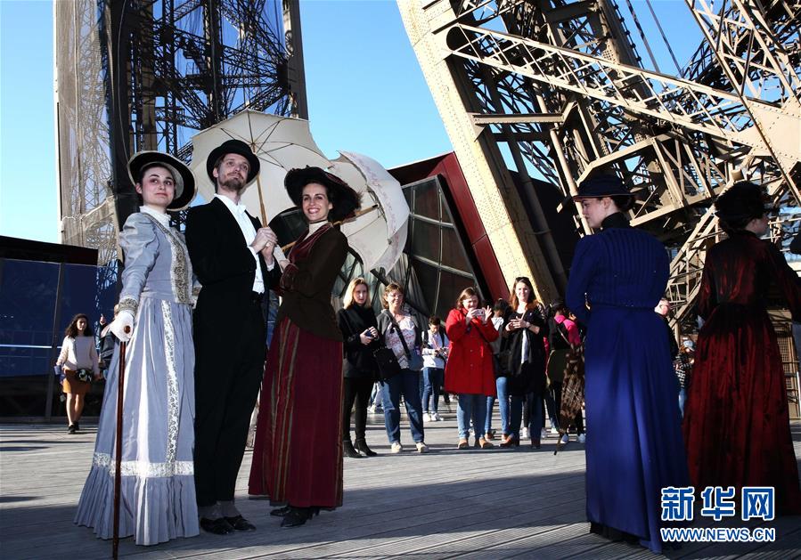 3月30日,在法國巴黎,音樂劇《300米高塔》的演員身著19世紀(jì)服裝在埃菲爾鐵塔一層平臺(tái)合影。于1889年3月31日正式落成的法國巴黎埃菲爾鐵塔迎來130歲生日。從30日起,包括演出、冒險(xiǎn)游戲、圖片展在內(nèi)的多項(xiàng)活動(dòng)在埃菲爾鐵塔舉行,為這座宏偉建筑慶生。新華社記者 高靜 攝