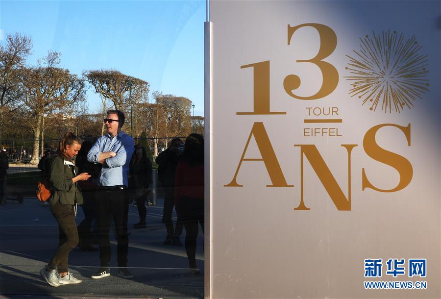 3月30日,在法國巴黎,人們走過慶祝埃菲爾鐵塔落成130周年的宣傳牌。于1889年3月31日正式落成的法國巴黎埃菲爾鐵塔迎來130歲生日。從30日起,包括演出、冒險游戲、圖片展在內(nèi)的多項活動在埃菲爾鐵塔舉行,為這座宏偉建筑慶生。新華社記者 高靜 攝