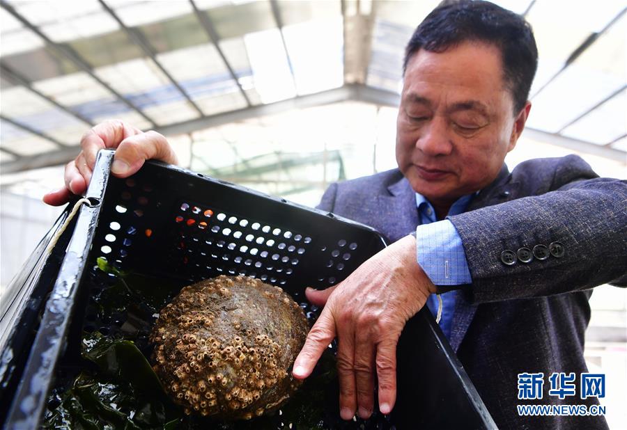 4月18日,連江縣筱埕鎮(zhèn)一家鮑魚養(yǎng)殖育種企業(yè)的技術人員展示新培育的美國綠鮑新品種。