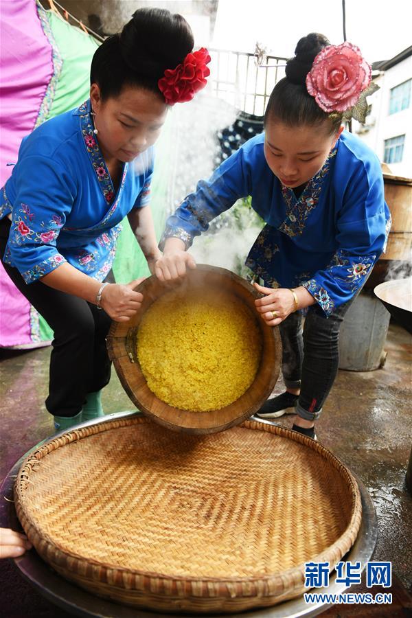 4月17日,在貴州省臺江縣姊妹街哆蝶五彩姊妹飯體驗店,苗家婦女將蒸熟的五彩“姊妹飯”進行攤晾。  新華社記者 楊文斌 攝