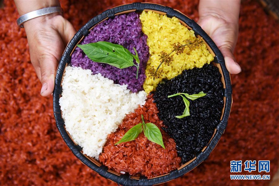 每年農(nóng)歷三月十五前后,貴州省黔東南苗族侗族自治州臺(tái)江縣苗族同胞有制作“姊妹飯”、喜迎姊妹節(jié)的習(xí)俗?!版⒚蔑垺笔鞘褂貌煌参锏臉淙~或花朵碾壓成汁液作為原色,對(duì)糯米進(jìn)行浸泡并蒸熟的五彩糯米飯。姊妹節(jié)期間,青年男子可以向心儀的姑娘討要“姊妹飯”,姑娘們則通過贈(zèng)送藏有不同物品的“姊妹飯”傳情達(dá)意。