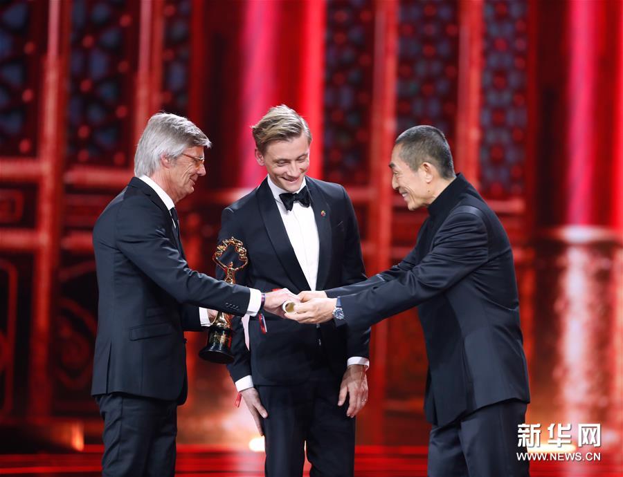 4月20日,影片《幸運(yùn)兒彼爾》獲得“天壇獎(jiǎng)最佳影片獎(jiǎng)”,張藝謀(右)為領(lǐng)獎(jiǎng)?wù)撸ㄗ螅╊C獎(jiǎng)。 當(dāng)日,第九屆北京國(guó)際電影節(jié)閉幕式暨頒獎(jiǎng)典禮在北京懷柔國(guó)家中影數(shù)字制作基地舉行。 新華社記者 沈伯韓 攝