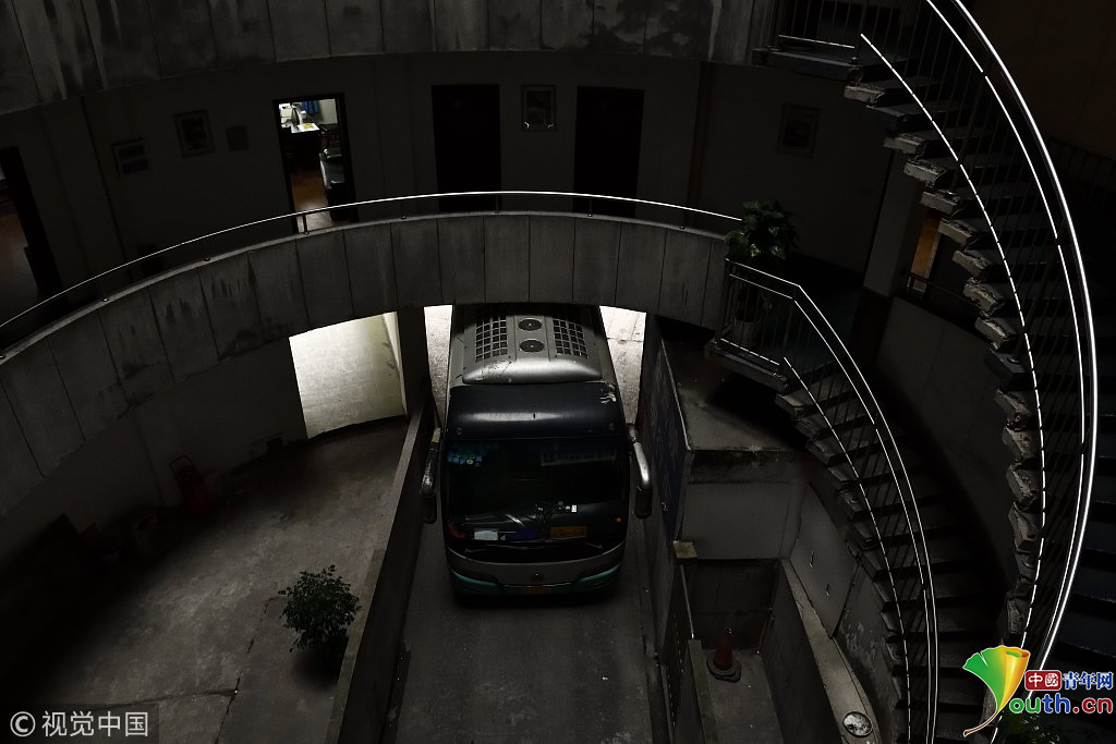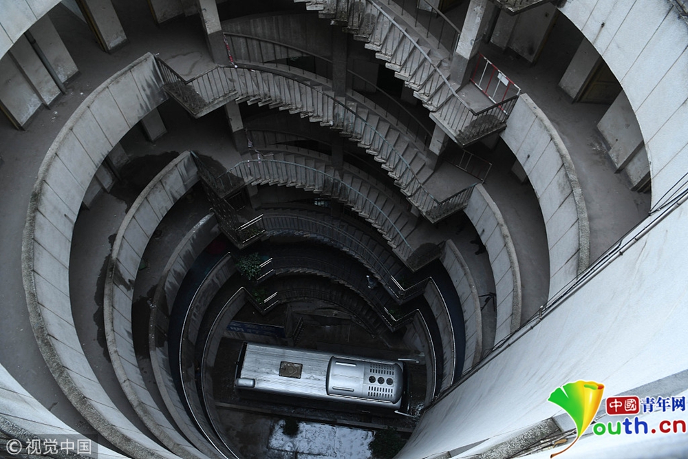 2018年12月6日,重慶江北紅旗河溝汽車站內,有一棟獨特的八層圓環(huán)狀建筑,底層每天有不少進出站的客車通行。圖為公交車穿過8層空心圓筒樓。
