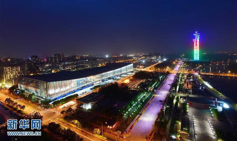 5月14日,國家會議中心和奧林匹克塔交相輝映。 當晚,一場“空間光影秀”在北京上演。 新華社記者 李賀 攝