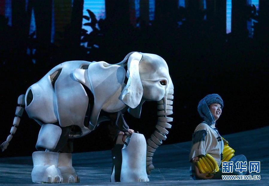 5月15日在上海美琪大戲院拍攝的新版大型人偶舞臺劇《最后一頭戰(zhàn)象》劇照。 當(dāng)日,作為第12屆中國藝術(shù)節(jié)的參演劇目,大型人偶舞臺劇《最后一頭戰(zhàn)象》在經(jīng)過4次硬件技術(shù)升級和故事修改后亮相上海美琪大戲院。 新華社記者 任瓏 攝