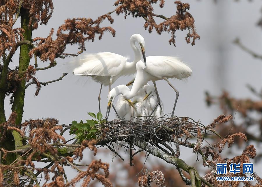 在江西省南昌市新建區(qū)象山森林公園內(nèi),白鷺和自己的雛鳥(niǎo)在一起(5月21日攝)。 近日,在江西省南昌市新建區(qū)象山森林公園內(nèi),已安家筑巢的大批鷺鳥(niǎo)陸續(xù)孵化出了后代。象山森林公園有著“鷺鳥(niǎo)王國(guó)”的美譽(yù),生態(tài)環(huán)境良好,每年都會(huì)吸引白鷺、蒼鷺、夜鷺等種類的鷺鳥(niǎo)飛抵棲息和繁衍后代。 新華社記者 彭昭之 攝