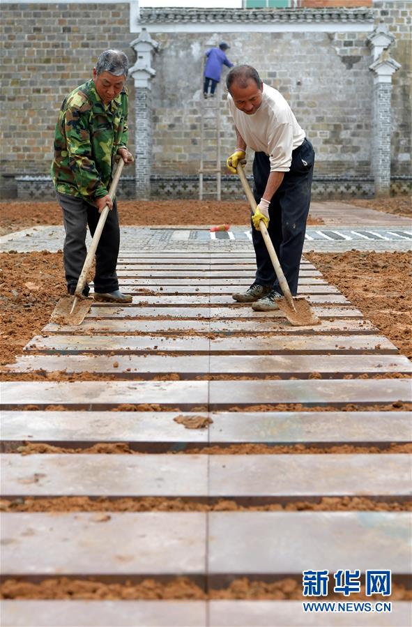 4月28日,在江西省南昌市南昌縣岡上鎮(zhèn)省級文物保護單位“吳氏家廟”內(nèi),搶修工程隊的工人在鋪磚。近年來,江西省南昌市南昌縣推動古村落保護工作。2019年,首批搶修工程隊進駐南昌縣岡上鎮(zhèn),對當?shù)刂氖〖壩奈锉Wo單位“吳氏家廟”及縣級文物保護單位“吳培荊堂古建筑群”進行搶救性維修。同時當?shù)卣€制定文旅規(guī)劃,讓文物保護與觀光旅游相結(jié)合,推動鄉(xiāng)村振興。 新華社記者 彭昭之 攝