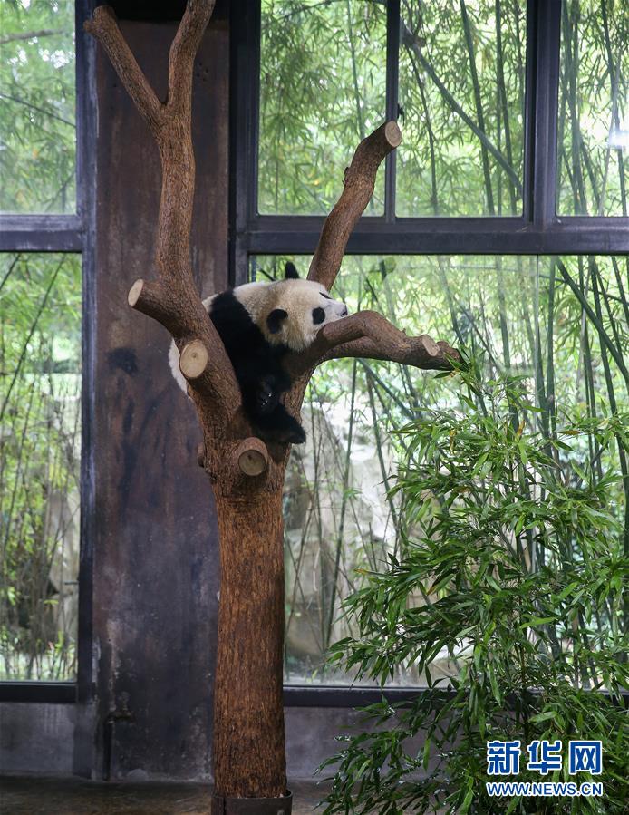 6月1日,在上海野生動物園,大熊貓寶寶“七七”在樹上休息。當日,上海野生動物園舉行命名儀式,宣布一只10個月大的大熊貓寶寶被正式命名為“七七”。新華社記者丁汀攝