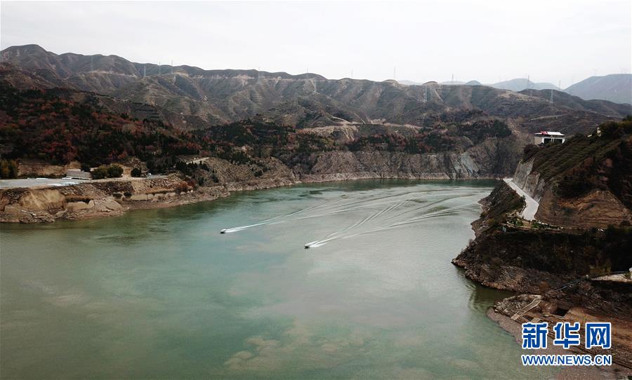 10月24日,兩艘快艇從劉家峽水庫庫區(qū)駛過(無人機(jī)拍攝)。  新華社記者 陳斌 攝