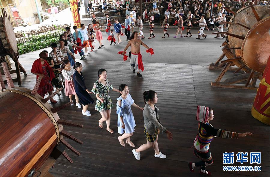 游客與基諾族大鼓舞演員一起跳舞(6月1日攝)。 在云南省西雙版納傣族自治州景洪市基諾山基諾族鄉(xiāng)的基諾族村寨,每天的基諾大鼓舞表演吸引了眾多游客前來觀賞體驗(yàn),帶動(dòng)了基諾族群眾就業(yè)和增收?;Z族大鼓舞蘊(yùn)涵豐富的歷史文化內(nèi)涵,已被列入國家級(jí)非物質(zhì)文化遺產(chǎn)保護(hù)名錄。 新華社記者 楊宗友 攝