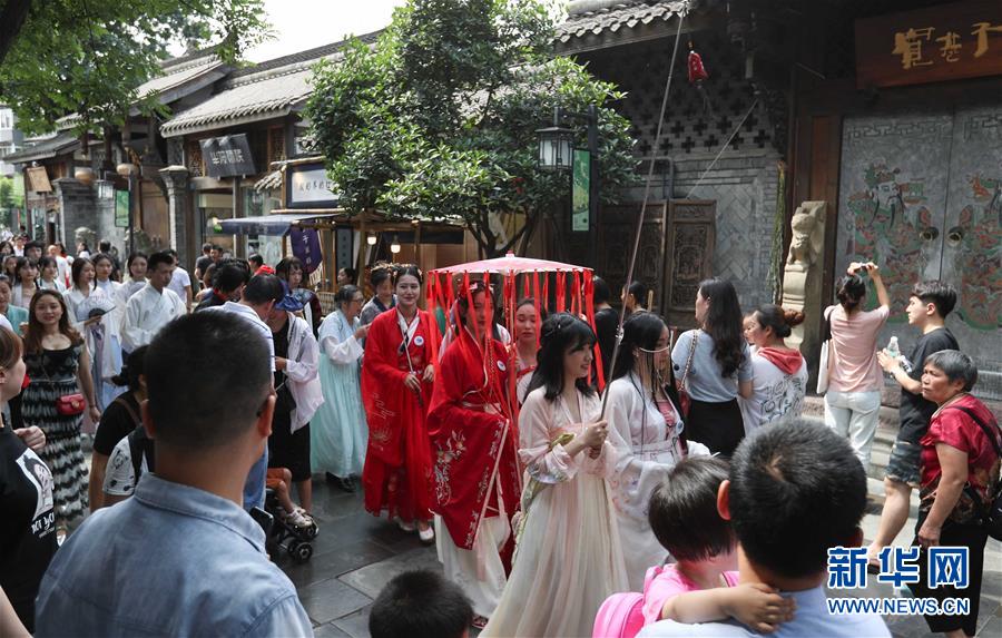6月9日,漢服愛好者在成都寬窄巷子巡游,宣傳“聞香識(shí)寬窄”主題活動(dòng)。新華社記者 江宏景 攝
