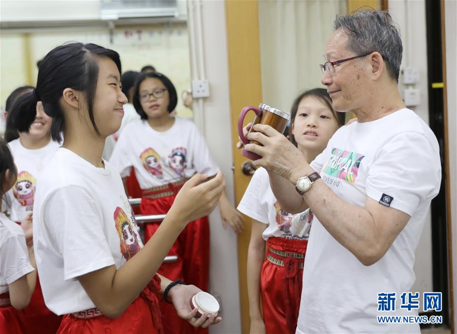 孩子們給79歲的粵劇名伶楊劍華敬茶(6月8日攝)。 聲輝粵劇推廣協(xié)會(huì)成立于2003年,是香港重要粵劇藝術(shù)團(tuán)體之一,致力于向青少年推廣粵劇。協(xié)會(huì)目前有兩個(gè)初班,3個(gè)中班,一個(gè)青少年班?;泟∮址Q“廣東大戲”,表演技藝包括“唱做念打”,即唱功、身段、臺(tái)詞、武打,主要流行于廣東、廣西和香港、澳門等地區(qū)。2009年,粵劇被列入聯(lián)合國(guó)教科文組織人類非物質(zhì)文化遺產(chǎn)代表作名錄,今年正逢十周年。 新華社記者 吳曉初 攝