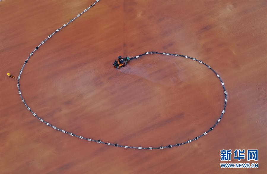 7月3日,唐山海港經(jīng)濟(jì)開發(fā)區(qū)大清河鹽場(chǎng)的工人在操作機(jī)械設(shè)備收獲春鹽(無人機(jī)拍攝)。