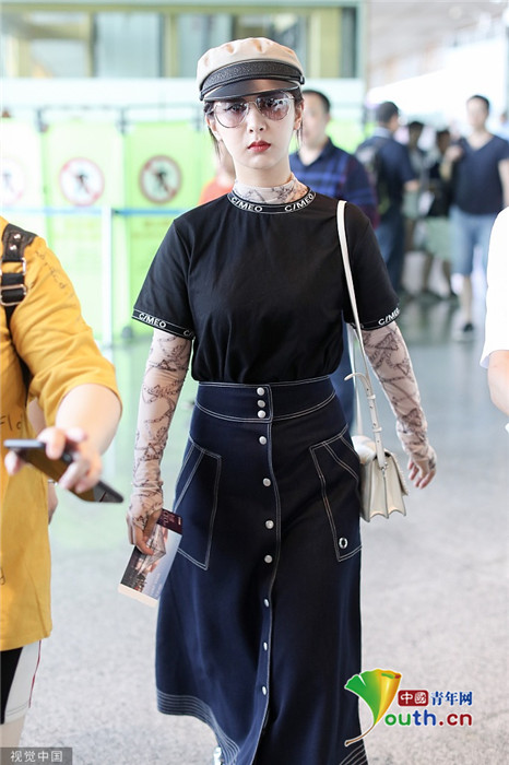 2019年7月25日,北京,楊紫現身機場。她穿黑色短T配牛仔裙變時髦女郎,戴報童帽架墨鏡”港風女sir“即視感,人氣爆棚。